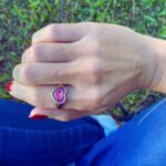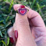Este anillo tiene un diseño elegante y ligero, ideal para usar en el día a día. Su forma es de corazón, representando el amor y la ternura. En el centro presenta otro corazón, dibujado con un tono más claro de color morado.