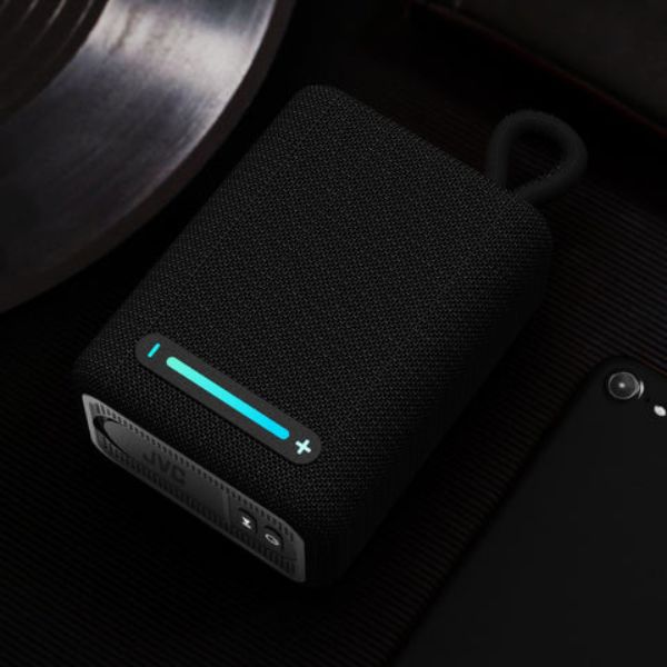 El parlante JVC Inalámbrico Portátil 5W, modelo XS-KY2113B, ofrece sonido claro y conexión Bluetooth. Resistente al agua (IPX6) y fácil de transportar con su correa incorporada, es ideal para usar al aire libre.