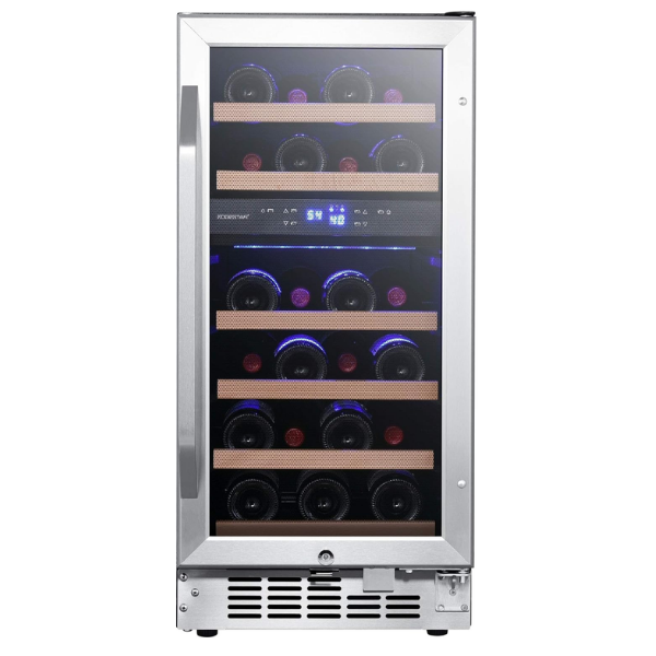 Asimismo, esta vinera ofrece dos zonas de temperatura controladas de manera independiente. Por ejemplo, la zona superior es ideal para vinos tintos, con temperaturas de 54 a 65 °F y espacio para cinco botellas. En cambio, la zona inferior mantiene los vinos blancos entre 40 y 54 °F, con capacidad para 18 botellas. De este modo, puedes conservar distintos tipos de vino sin afectar su sabor ni su calidad.