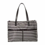 Es un modelo con tapa abierta y cierre con cremallera superior. El interior cuenta con un compartimento abierto y un bolsillo con cremallera en la pared trasera. Destaca por su diseño a rayas blanco y negro.