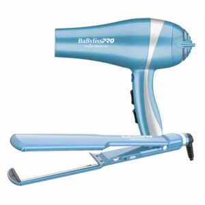 Este kit incluye un secador y una plancha alisadora con tecnología iónica doble. Activa o desactiva la función iónica para personalizar tu peinado. El secador tiene un motor sin escobillas, mientras que la plancha ofrece cinco ajustes de temperatura y un cable giratorio de 9 pies.
