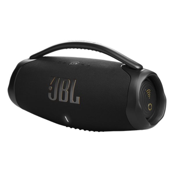El JBL Boombox 3 Wi-Fi es un altavoz portátil que ofrece sonido potente y graves profundos con tecnología JBL Original Pro. Es resistente al agua y polvo y ofrece 24 horas de batería.