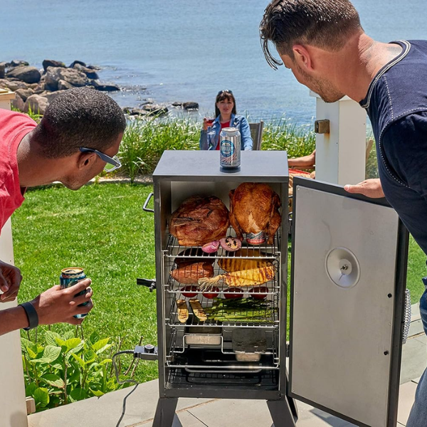 El ahumador eléctrico Cuisinart COS-330 es una excelente opción para quienes disfrutan cocinar al aire libre. En primer lugar, su diseño vertical y su tamaño compacto permiten colocarlo fácilmente en patios o cocinas de barbacoa. Además, su amplio interior de 548 pulgadas cuadradas ofrece suficiente espacio para preparar diferentes tipos de carnes y verduras al mismo tiempo. Por lo tanto, es una alternativa práctica y funcional para quienes buscan resultados profesionales sin complicaciones. Su estructura de acero inoxidable, por otro lado, garantiza durabilidad y una apariencia moderna.