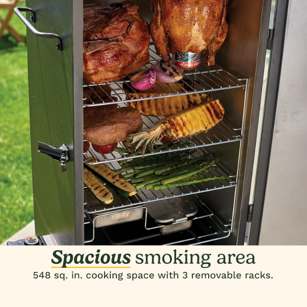 El ahumador eléctrico Cuisinart COS-330 es una excelente opción para quienes disfrutan cocinar al aire libre. En primer lugar, su diseño vertical y su tamaño compacto permiten colocarlo fácilmente en patios o cocinas de barbacoa. Además, su amplio interior de 548 pulgadas cuadradas ofrece suficiente espacio para preparar diferentes tipos de carnes y verduras al mismo tiempo. Por lo tanto, es una alternativa práctica y funcional para quienes buscan resultados profesionales sin complicaciones. Su estructura de acero inoxidable, por otro lado, garantiza durabilidad y una apariencia moderna.