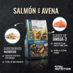 La proteína de salmón protege y refuerza las articulaciones de tu mascota, manten en perfecto estado la piel y el pelo, reduce los riesgos de enfermedades cardiovasculares y controla el colesterol, refuerza el sistema inmunológico y aporta Omega 3. El Alimento Total Nutrition Salmón/Avena es una excelente opción de alimento para perro adulto. El salmón aporta proteínas, aminoácidos esenciales, ácido omega-3 y muchas otras vitaminas y minerales que serán beneficiosas para su salud.