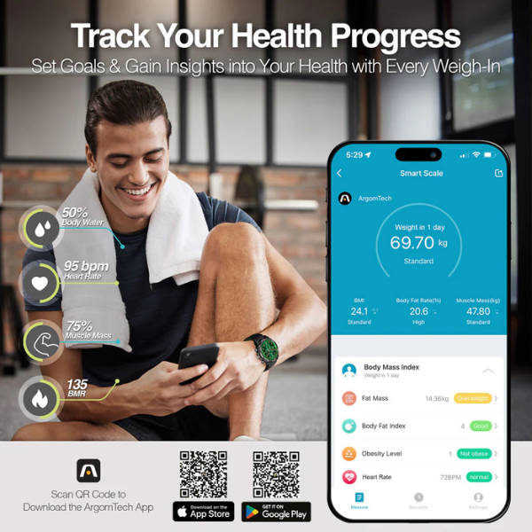 Gracias a su conectividad Bluetooth, puedes sincronizar tus datos con la app ArgomTech y seguir tu progreso de forma fácil y ordenada. También, la báscula es compatible con Google Fit, Apple Health y Fitbit, lo que te permite gestionar tus objetivos de salud y compartir resultados con amigos o familiares. Con hasta 10 perfiles de usuario, todos en casa pueden usarla sin problemas.