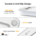 En primer lugar, su diseño moderno en vidrio templado de 5 mm y la pantalla LED facilitan la lectura de los resultados al instante, haciendo que cada medición sea sencilla y rápida.