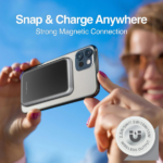 Asimismo, este cargador portátil incluye carga inalámbrica magnética de 15 W, lo que permite recargar tu teléfono de forma sencilla y rápida con solo colocarlo encima. De hecho, la conexión magnética es fuerte y segura, evitando que el dispositivo se deslice durante la carga. Al mismo tiempo, cuenta con un puerto USB-C con carga rápida PD de 20 W, ideal para quienes necesitan energía adicional en menos tiempo. De esta manera, tendrás la libertad de elegir el método de carga más cómodo.