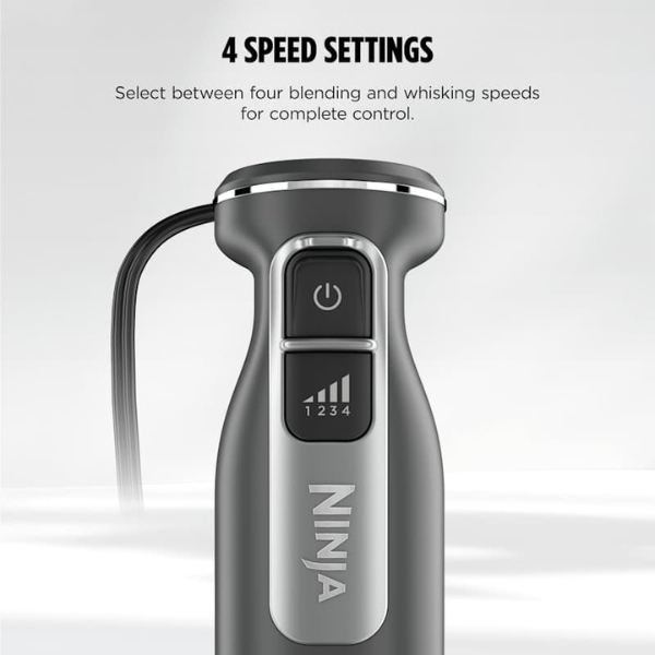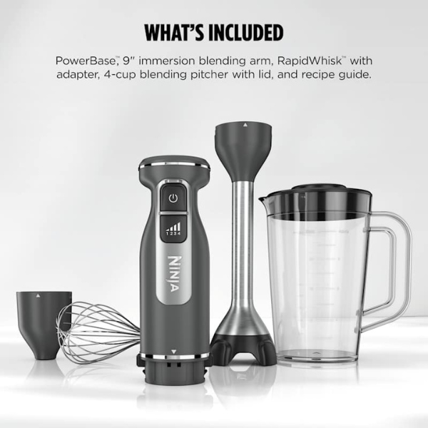 La Batidora de Inmersión Ninja Power Duo mezcla, licúa y bate con facilidad. Su Splattershield evita salpicaduras, incluye RapidWhisk y jarra de 4 tazas. Piezas aptas para lavavajillas y libres de BPA, ideal para cocinar rápido y limpio.