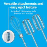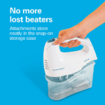 La batidora de mano Proctor Silex 62682G mezcla ingredientes con facilidad y control, y además tiene 6 velocidades con botón QuickBurst y un estuche a presión para guardar accesorios ordenados, por lo tanto es práctica para hornear y cocinar todos los días.