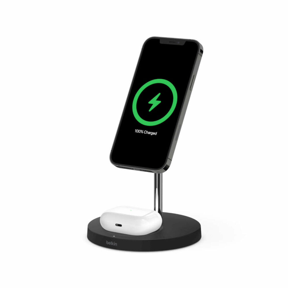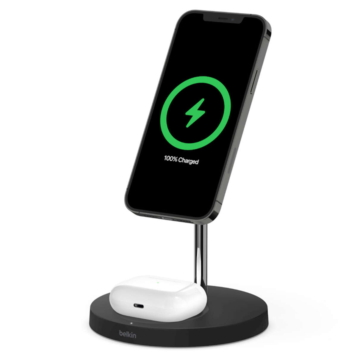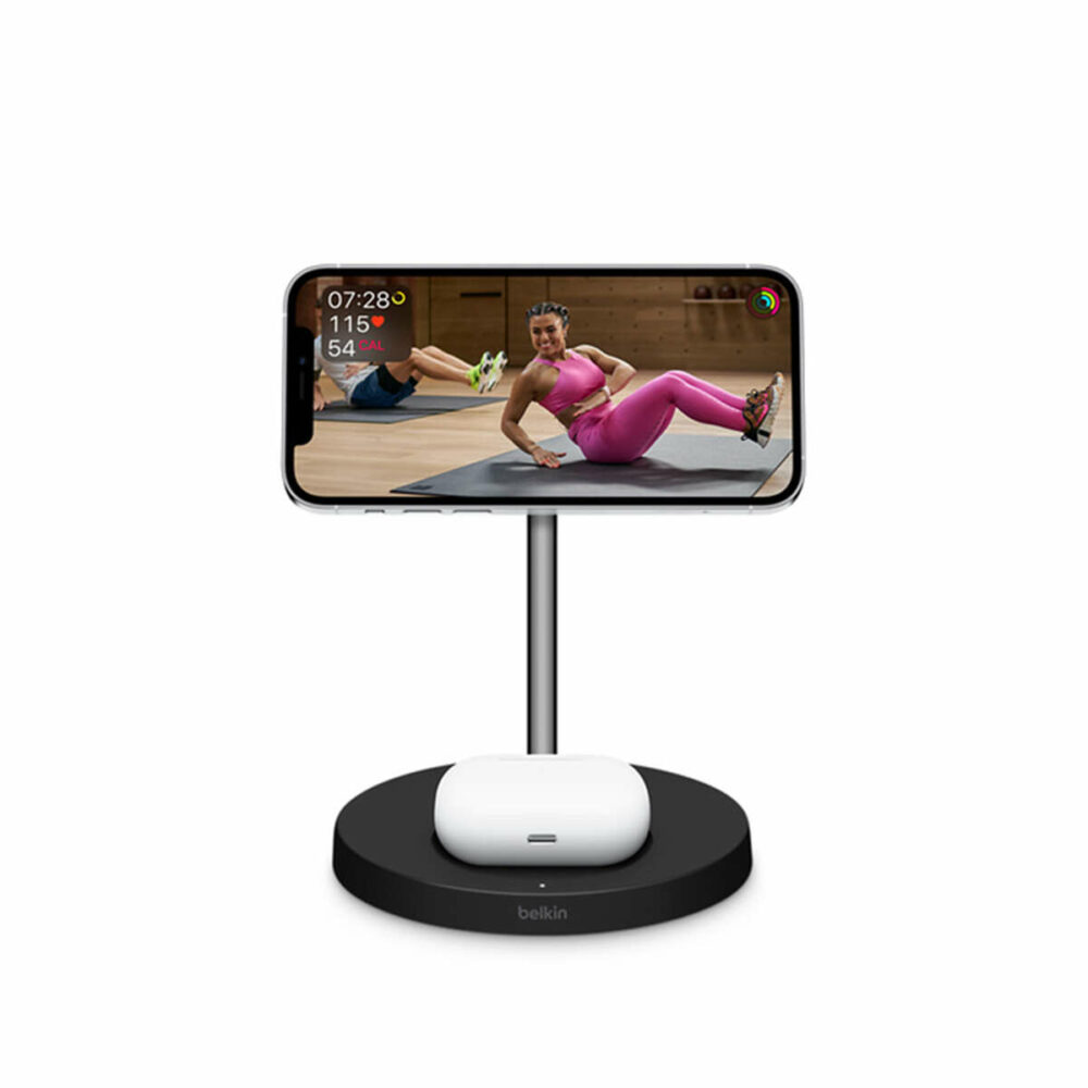 Ahora es más fácil que nunca mantener cargador tus elementos esenciales de Apple. Debajo del soporte de carga inalámbrico magnético de 15 W para tu dispositivo de la serie iPhone 12 hay una plataforma de carga optimizada para tus AirPods.