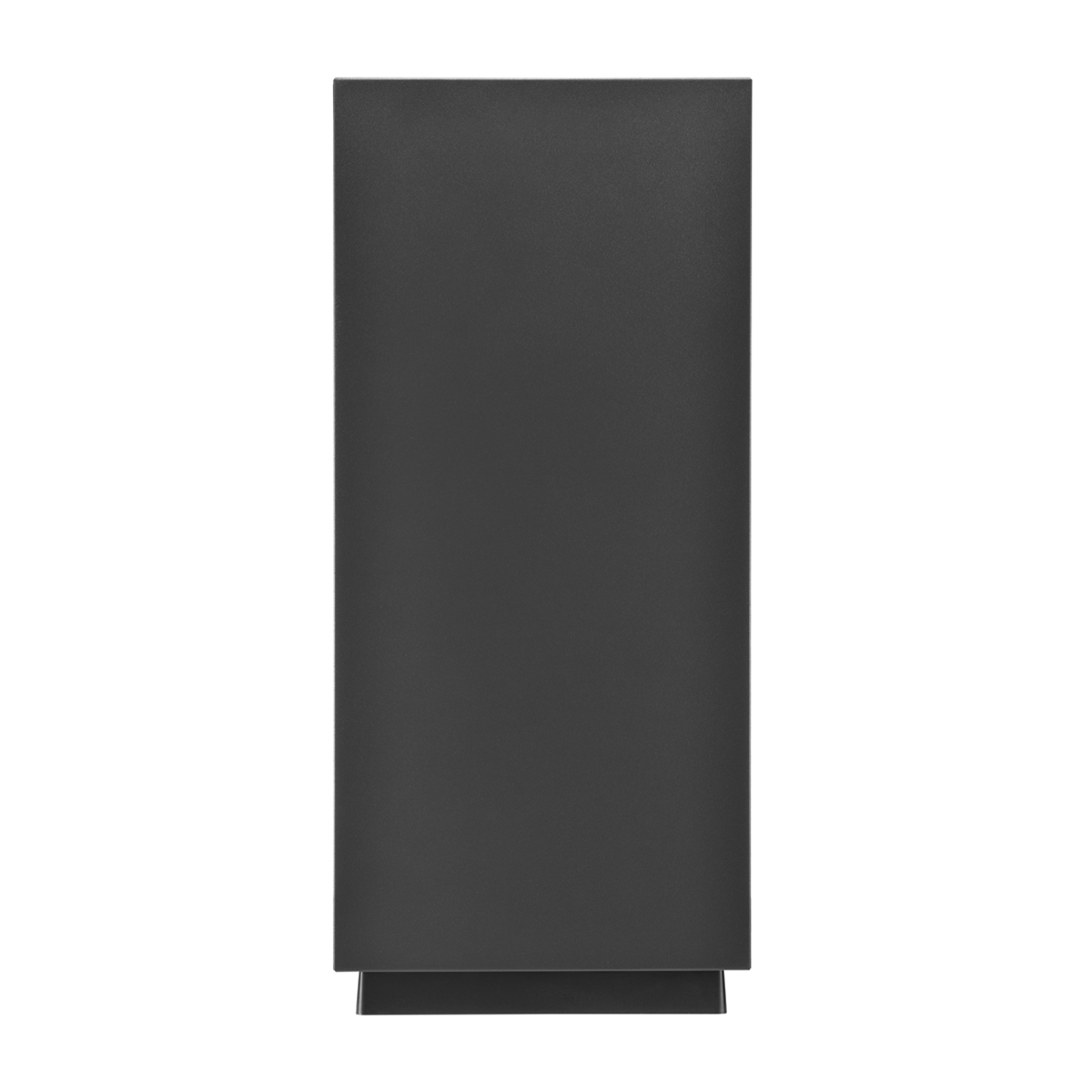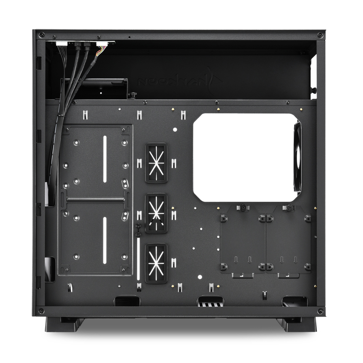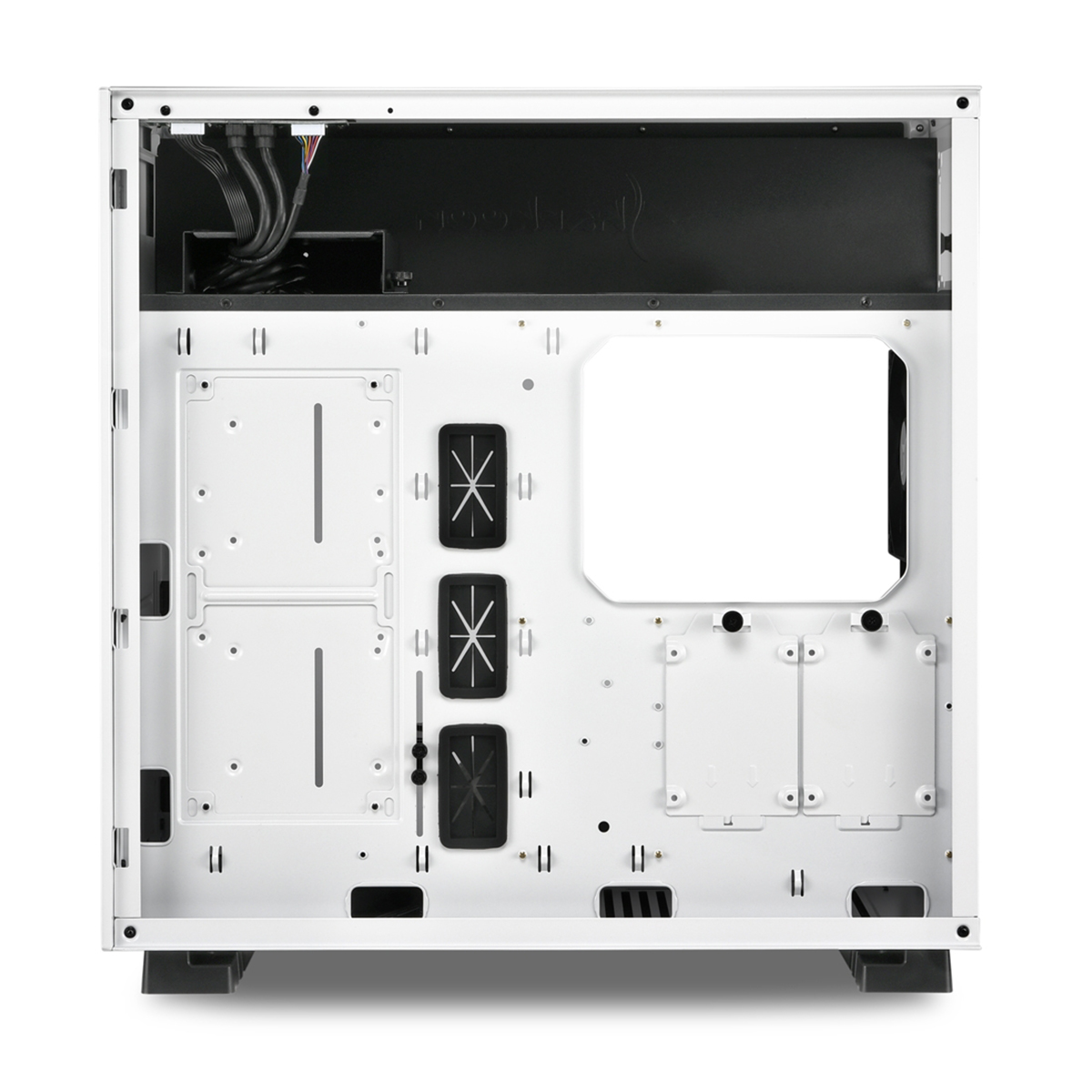 El panel frontal tiene un diseño completamente minimalista, así que nada distrae nuestra atención del hardware. El panel lateral de vidrio templado, por lo tanto, se convierte en el protagonista de la caja, presentándonos el interior de la misma con todo el hardware instalado. El case Pure Steel es ideal para la presentación en el tablero de PC montados.