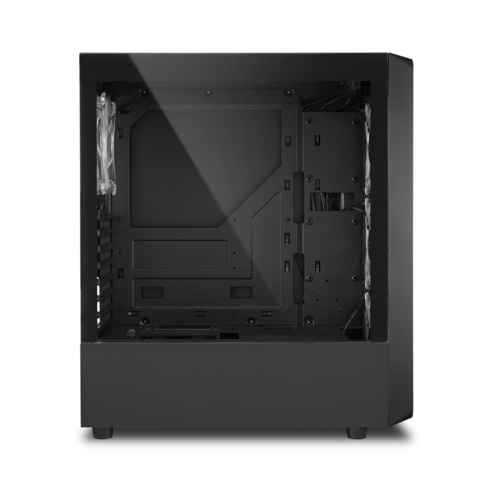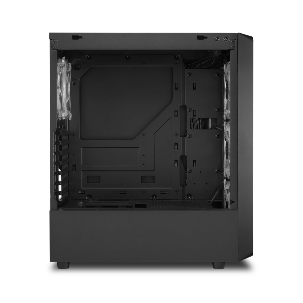 El cuarto ventilador LED RGBU, está ubicado en la parte trasera, este no solo ilumina el interior de la caja en colores elegantes, sino que además permite generar un flujo de aire óptimo y homogéneo. Dado que el panel lateral está fijado a la parte posterior de la caja, no hay tornillos visibles que puedan distraernos de la apariencia moderna de la caja.
