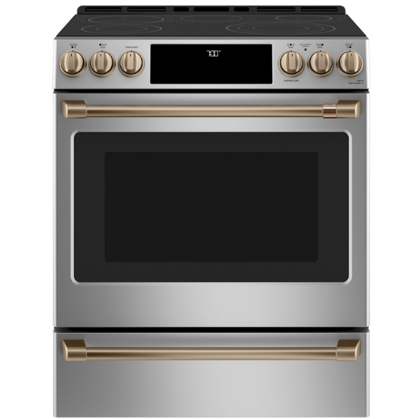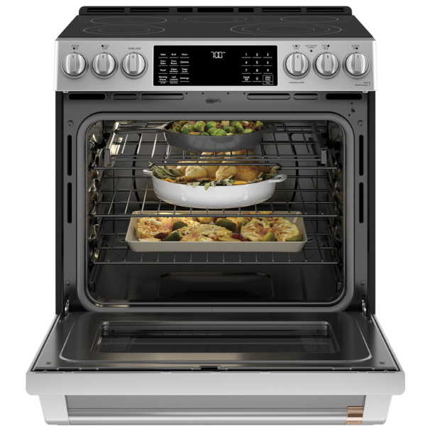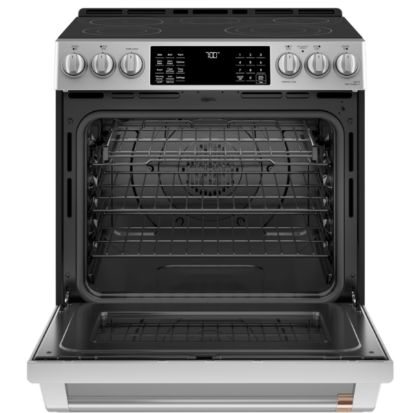 La Cocina Café Eléctrica 30″ CES700P2MS1 combina diseño moderno con funciones avanzadas que facilitan la vida diaria. Además, entre sus accesorios se puede incluir una cesta para freír al aire y kits opcionales en diferentes acabados como negro cepillado, bronce, cobre, acero inoxidable, latón o negro mate. Por otra parte, ofrece la opción de un kit de molduras para personalizar su instalación y lograr una apariencia al ras que se adapta a distintos estilos de cocina.