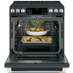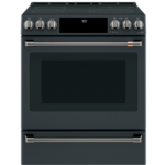 La cocina Café Eléctrica 30″ CES700P3MD1 combina estilo y funcionalidad para cualquier hogar. Además, su acabado en negro mate y las perillas de acero inoxidable le dan un aspecto moderno y profesional. Por otra parte, el diseño del mango CAFÉ™ es fácil de usar y se puede personalizar según las necesidades del usuario. También, la instalación es flexible, permitiendo un recorte independiente y una apariencia al ras. Asimismo, la puerta del horno incluye una ventana de gran tamaño y es fácil de limpiar, mientras que los paneles laterales son de acero texturizado para mayor durabilidad.