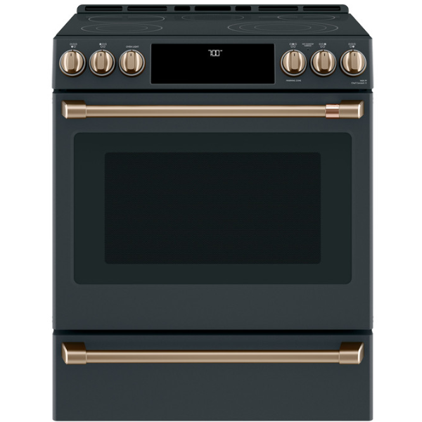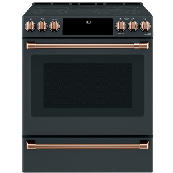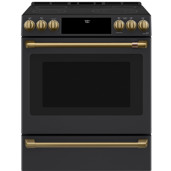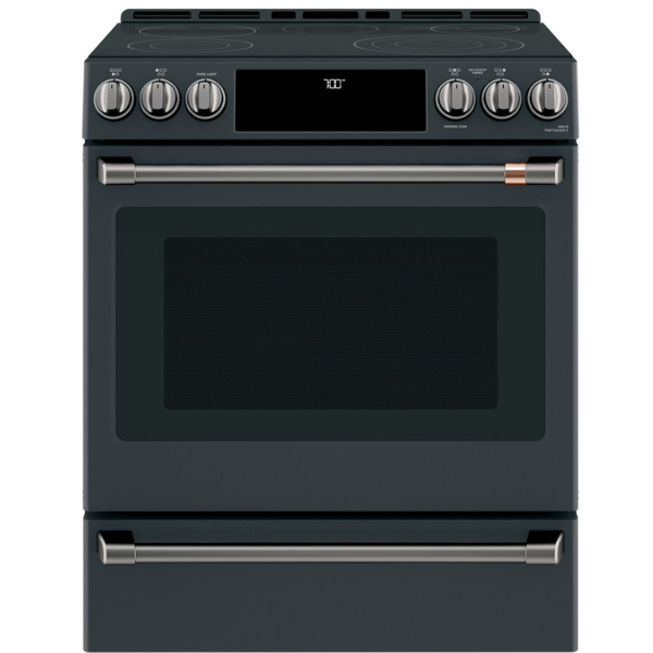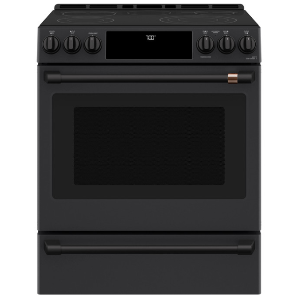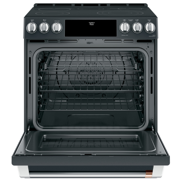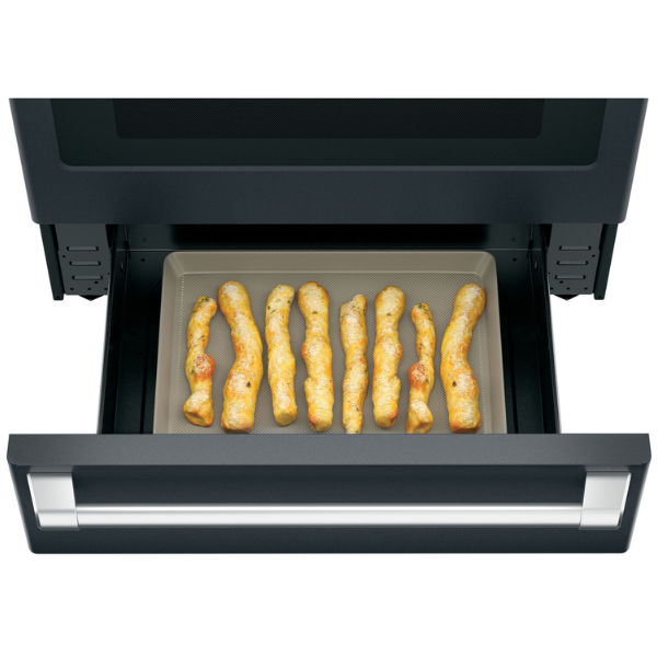 La cocina Café Eléctrica 30″ CES700P3MD1 combina estilo y funcionalidad para cualquier hogar. Además, su acabado en negro mate y las perillas de acero inoxidable le dan un aspecto moderno y profesional. Por otra parte, el diseño del mango CAFÉ™ es fácil de usar y se puede personalizar según las necesidades del usuario. También, la instalación es flexible, permitiendo un recorte independiente y una apariencia al ras. Asimismo, la puerta del horno incluye una ventana de gran tamaño y es fácil de limpiar, mientras que los paneles laterales son de acero texturizado para mayor durabilidad.