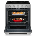 Igualmente, integra un quemador central 2 en 1; es decir, permite usar sartén grande o plancha según lo necesites. También suma conectividad WiFi; por lo tanto, puedes monitorear y controlar funciones desde la app. En resumen, esta cocina KitchenAid a gas 30 pulgadas combina tecnología, capacidad y estilo en un solo equipo.