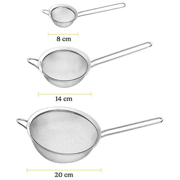 Por otra parte, este juego incluye tres tamaños diferentes: uno de 3 pulgadas, otro de 5 ½ pulgadas y un tercero de 7 pulgadas. Gracias a esta variedad, puedes utilizarlos para tamizar harina, colar frutas o escurrir verduras de forma rápida y sencilla. Asimismo, estos tamaños permiten adaptarse a diferentes recetas, desde preparaciones simples hasta platos más elaborados, lo que los convierte en una opción muy versátil.