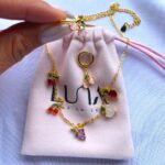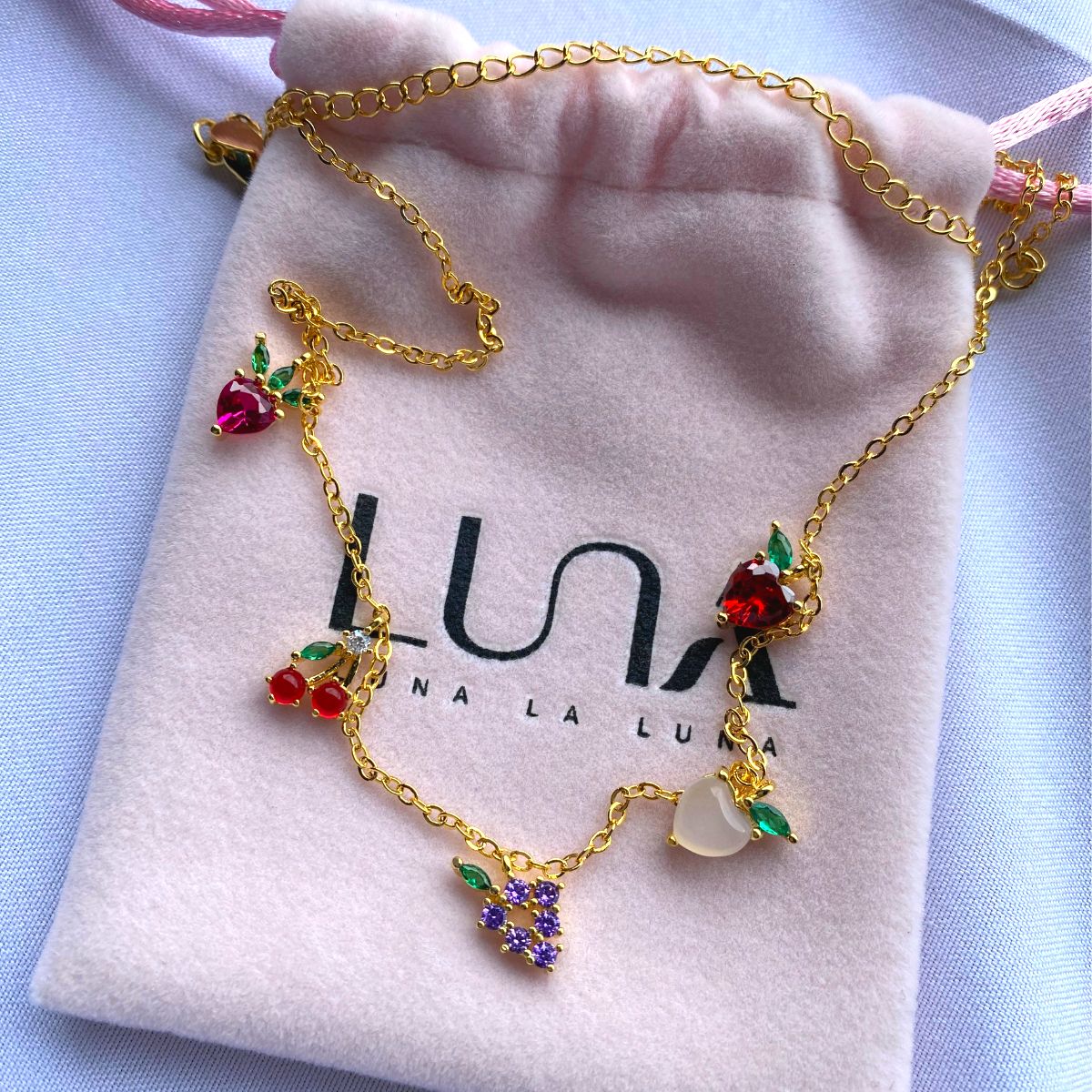 Se trata de tres accesorios fáciles de combinar, el collar es una cadena dorada de eslabones pequeños y cierre de gancho ajustable, con cinco dijes en forma de frutas que cuelgan y además tienen una piedra brillante.