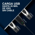 Por otro lado, el recortador funciona hasta 45 minutos de manera inalámbrica, lo que te da libertad para usarlo sin depender de un enchufe. También, se carga fácilmente con USB, y algunos accesorios pueden funcionar con pilas. En consecuencia, es muy práctico para viajes o para usar en cualquier lugar de la casa.