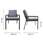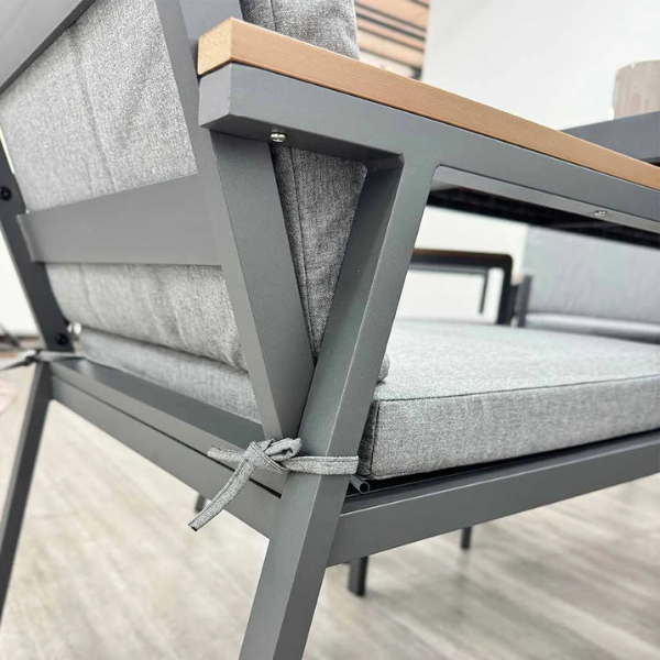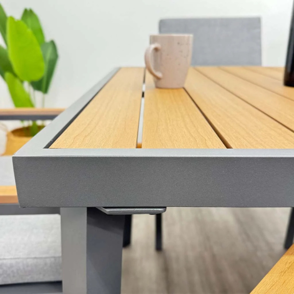 Asimismo, los materiales usados requieren muy poco mantenimiento, lo que facilita su uso diario. La madera plástica mantiene su color y textura, mientras que el aluminio sigue ligero y firme con el paso del tiempo. Así, todo el conjunto permanece en perfecto estado durante más años.