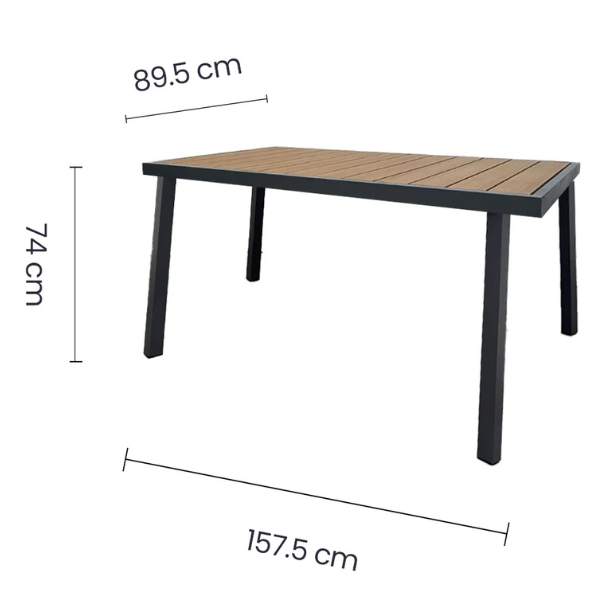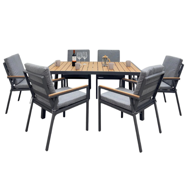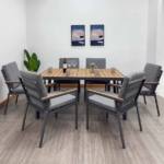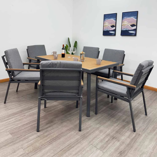 El Comedor exterior Tokoa EX-7183 de seis sillas es una opción ideal para quienes buscan un conjunto resistente y moderno para exteriores. Además, gracias a su estructura de aluminio anticorrosión, ofrece firmeza y una larga vida útil incluso bajo sol, humedad o clima cambiante. Su diseño combina líneas limpias con materiales que imitan la madera para lograr un estilo natural y agradable.