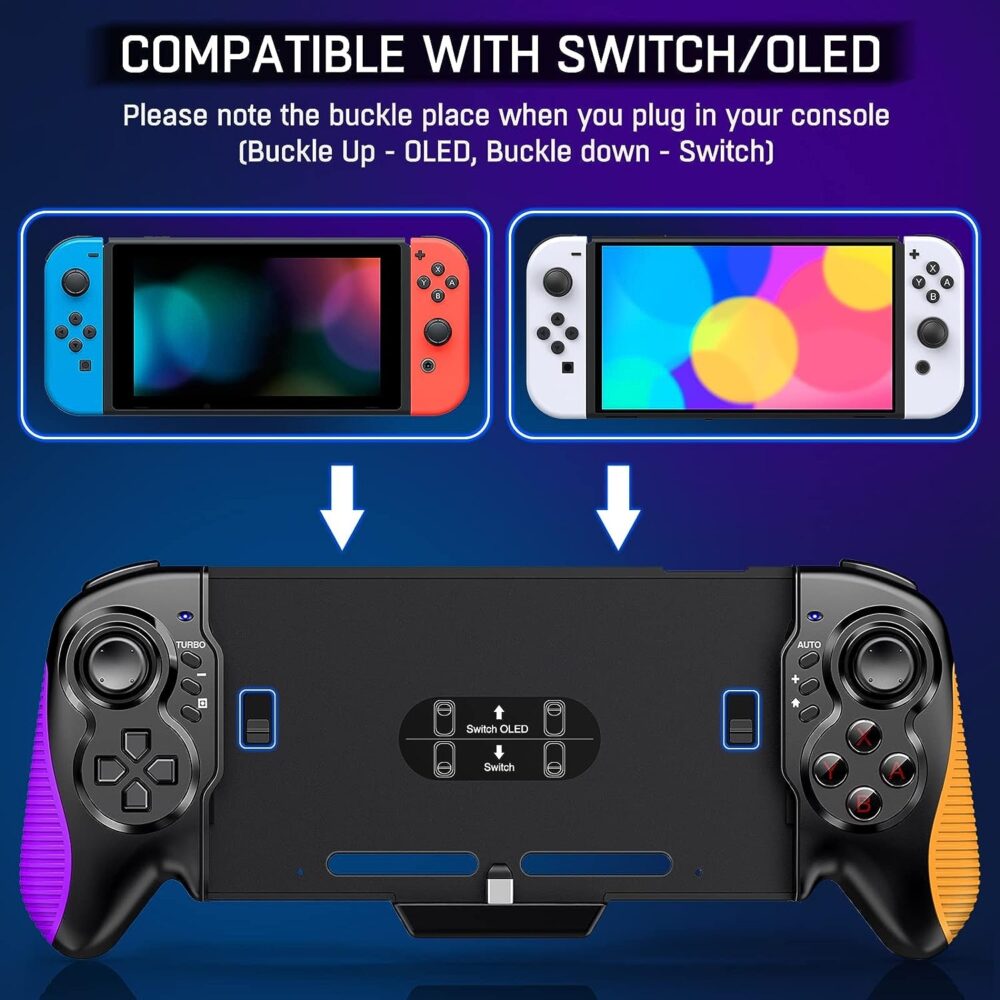 Tested with a swith OLED. To set up: enable «Pro Controller Wired Commulication» in controller settings. System must be turned on to trigger a response, just like a pro controller, and works very well for what it is. The product feels good quality, and the sticks feel realy good in my hands, with no drift so far. I’ve been looking for a replacement that allows me to play handheld without my hands cramping up and this seems to fit the bill. Nintendo seems to only make products for child-sized hands, So this pruduct is perfect for me. The switch fits snug in the slide clips so it ain’t flying out with riggerous play.What it is:-A controller sleeve acting as plugged in switch pro controller-The layout is closer to traditional controllers so keep that in mind. It’s not offset like the joycons.-The buttons feel springy and responsive. Triggers giving multiple pressure points for precision. The sticks are bigger and more sensitive, making a satisfying mechanical ‘click’ when compressed.-The -/+ buttons are better situated; but, I accidentally tap Home and Share more than a few times.-has turbo and auto function buttons, for those that want them-the dynamic rumble feels better, deeper and not as loud.-The charge port makes it possible to play plugged in, but same problem as normal where it will pivot directly on the power cord.-It does add extra weight, so it causes fatigue with long sessions held up.-appears to be more efficient with battery.What this is not:-Their is no switch or operation system in this, only a controller sleeve.-cannot replace the joycons completely. Home button does NOT trigger system power. Still need them to turn on system or plug in cord to trigger response.-does not have amiibo reader-does not function like seperate joycons.All things considered this is an amazing product, but it’s flaws do miff me something fierce. I do prefer this compared to standard switch set up, so I will continue to enjoy it.