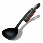 A su vez, el diseño del mango incluye un orificio para colgar, lo cual facilita su almacenamiento en la cocina. Esta característica no solo ayuda a mantener el utensilio a mano, sino que también permite guardarlo fácilmente en cajones o portautensilios. Así, la cuchara es perfecta para servir sopas, salsas, guisos y más sin rayar los recipientes.