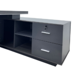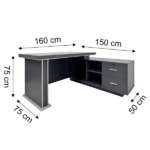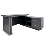 Escritorio ejecutivo en L color gris con pasa cable y dos gavetas, una con llave. Además, incluye estantes y sobre grueso resistente. Por lo tanto, es ideal para oficina u hogar, ya que combina orden, diseño y funcionalidad.