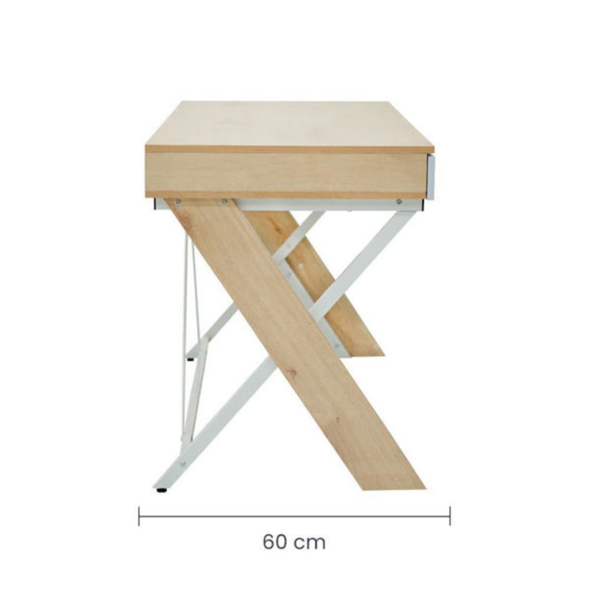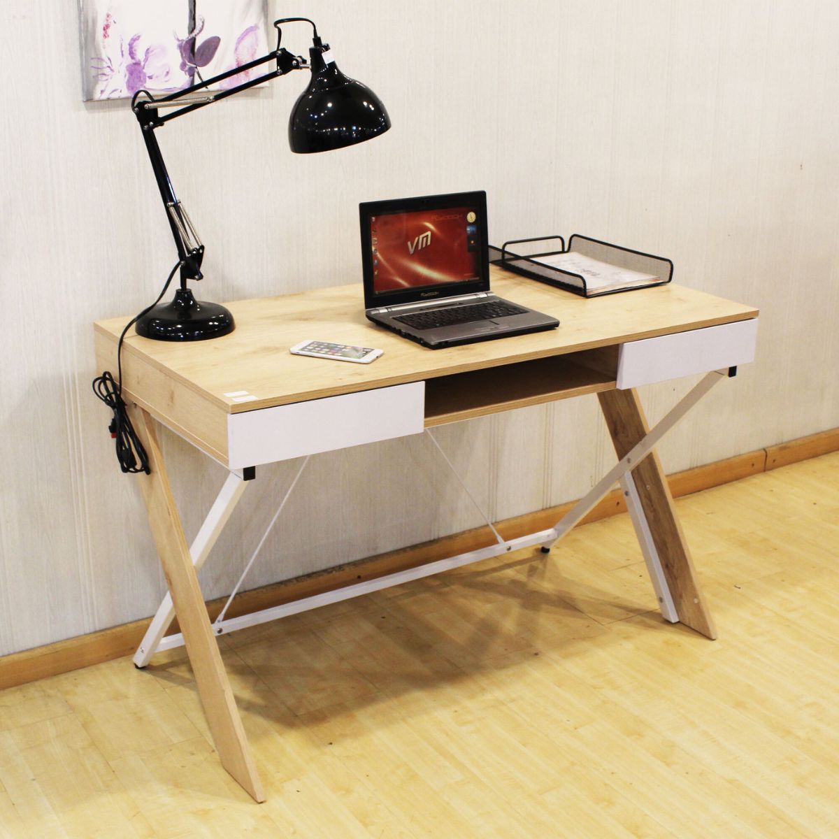 Es un escritorio moderno, estructurado en metal con madera aglomerada laminada en PVC, que da como resultado un escritorio bastante resistente y estable, pero con diseño liviano.
