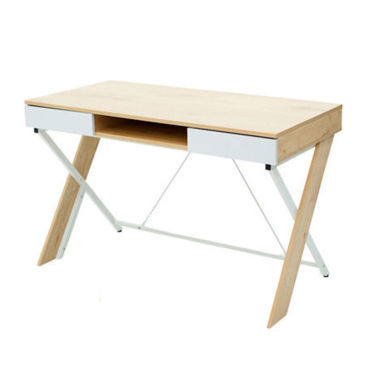 Es un escritorio moderno, estructurado en metal con madera aglomerada laminada en PVC, que da como resultado un escritorio bastante resistente y estable, pero con diseño liviano.