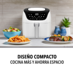 Finalmente, cuenta con 5.7 litros de capacidad, 1500 vatios de potencia y puede alcanzar temperaturas de hasta 220°C. Además, su temporizador con apagado automático y la notificación de agitar garantizan que tus platillos queden perfectamente cocidos. En resumen, es una opción práctica, saludable y confiable para tu cocina.