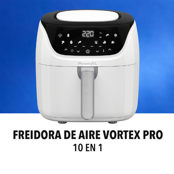 De igual manera, la Power XL Vortex ofrece 10 funciones programadas que permiten freír con aire, asar, hornear, hervir con aire, rostizar, deshidratar, descongelar, recalentar, cocinar vegetales y pescado. Por consiguiente, es muy versátil y perfecta para distintos tipos de recetas sin complicaciones. Además, sus piezas son aptas para lavavajillas y cuentan con recubrimiento antiadherente, lo que simplifica la limpieza después de cocinar.