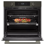 El horno KitchenAid Convección 30″ KOES730SBE presenta un diseño moderno en color mineral negro con herrajes a juego. Además, cuenta con una pantalla táctil fácil de usar. Asimismo, las perillas retroiluminadas indican el proceso de precalentado. De esta forma, el control es claro; además, cocinar resulta más práctico y seguro en todo momento.