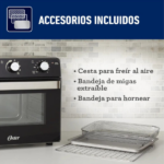 Por último, el Horno Oster incluye bandeja de malla para freír con aire y bandeja de migas extraíble, lo que hace la limpieza aún más sencilla. Gracias a su diseño de mesa, potencia de 1700 W y cinco funciones en un solo aparato, es la opción perfecta para simplificar la cocina diaria. En resumen, es ideal para quienes buscan rapidez, comodidad y comidas deliciosas en casa.