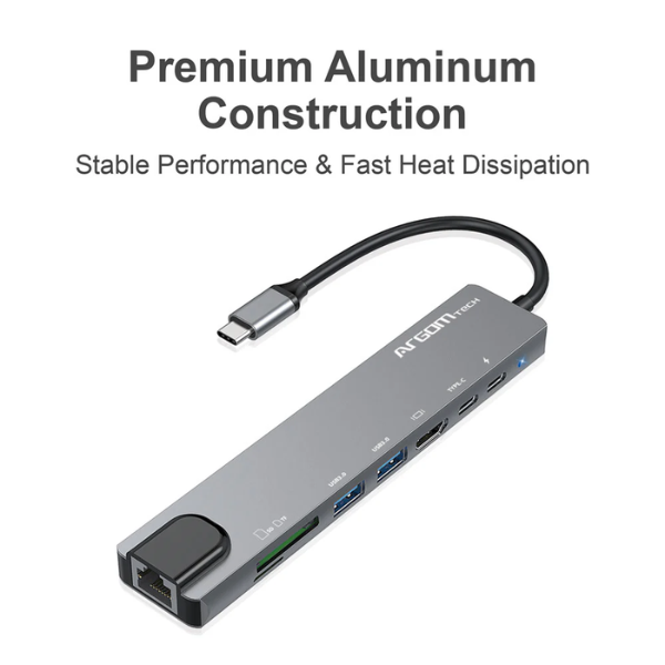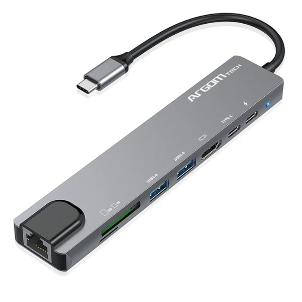 • Hub Adaptador Argom 8 en 1 Type C para computadoras y smartphones.