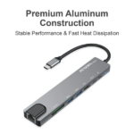 Por otro lado, este concentrador ofrece múltiples puertos útiles. Por ejemplo, puedes usar el puerto HDMI para conectar tu monitor o proyector y disfrutar de resoluciones de hasta 4K. Asimismo, los puertos USB 3.0 permiten conectar memorias, discos duros, teclados y ratones con velocidades de transferencia de hasta 5 Gbps. Además, cuenta con un puerto RJ-45 para internet rápido de hasta 1 Gbps y ranuras para tarjetas SD y Micro SD.