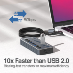 El Hub Adaptador Argom USB A+C a 7 puertos USB es una excelente opción para mejorar la conectividad de tus dispositivos. Además, este concentrador 2 en 1 combina puertos Tipo-C y USB 3.0, permitiendo conectar hasta siete dispositivos al mismo tiempo. Por otro lado, cada puerto cuenta con un interruptor individual y un indicador LED, lo que facilita controlar la energía y el uso de cada dispositivo de manera eficiente.