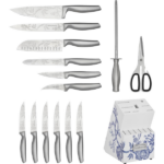El set incluye 15 piezas, entre ellas cuchillo de chef, Santoku, rebanar, pelar, tijeras y bloque de madera azul y blanco. En consecuencia, cada herramienta ofrece versatilidad y precisión. Así, se adapta a todo tipo de tareas en la cocina.