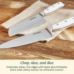 Por otra parte, este completo set incluye todo lo necesario para preparar una gran variedad de alimentos. Contiene un cuchillo cocinero de 8″, un rebanador de 8″, un Santoku de 7″, un cuchillo de uso general de 5.5″, un cuchillo para pelar de 3.5″ y otro especial para aves de 2.75″. Asimismo, incluye seis cuchillos para filete de 4.5″, un acero para afilar de 8″, tijeras de uso múltiple y un bloque de madera para mantener todo en orden y al alcance de la mano.