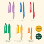 Este set incluye un cuchillo de chef de 8″, un cuchillo para pan tipo sierra de 8″, un cuchillo de corte de 8″, un cuchillo Santoku de 7″, un cuchillo utilitario de 6.5″ y un cuchillo para pelar de 3.5″. Además, viene con 6 cubiertas a juego que protegen las hojas y facilitan su almacenamiento seguro. Gracias a esto, la codificación por colores ayuda a evitar la contaminación cruzada al preparar diferentes alimentos.