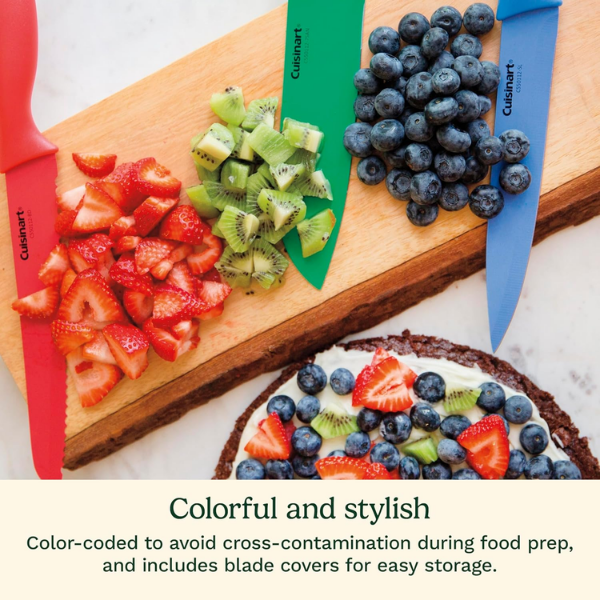 El juego de cuchillos Cuisinart de 12 piezas es ideal para cualquier cocina. Además, está fabricado con acero inoxidable de alta calidad, lo que garantiza durabilidad y resistencia. Por otro lado, su diseño multicolor lo hace atractivo y moderno, perfecto para quienes buscan estilo y funcionalidad. Asimismo, cada cuchillo tiene un filo serrado que facilita cortar diferentes tipos de alimentos sin esfuerzo.