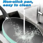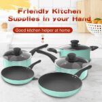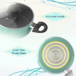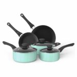 En primer lugar, este set incluye una variedad de utensilios esenciales: una sartén de 8″, una sartén de 10″ y tres cacerolas. Estas ollas están diseñadas meticulosamente para facilitar tanto la preparación como la limpieza, gracias a su revestimiento antiadherente de alta calidad.