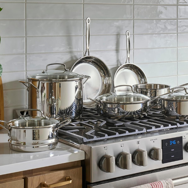 El juego de ollas Cuisinart de 11 piezas está hecho en acero inoxidable y, además, tiene un acabado plateado que luce moderno y limpio. Al mismo tiempo, incluye cacerolas de 1,5 y 2,5 cuartos, una sartén de 3 cuartos con tapa, una olla de 8 cuartos, sartenes de 8” y 10”, y una vaporera de 18 cm. Por lo tanto, ofrece todo lo necesario para preparar recetas sencillas o platos más elaborados sin complicaciones.