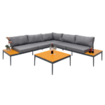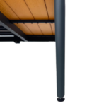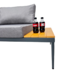 La estructura está fabricada en acero galvanizado resistente a la oxidación, por lo que soporta sin problemas el uso exterior. Además, las superficies de mesa elaboradas en madera plástica brindan una apariencia cálida y una durabilidad superior. Junto a esto, los cojines acolchados con tela resistente al agua permiten disfrutar del confort aun en climas variables.