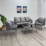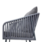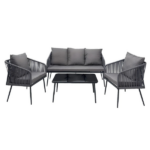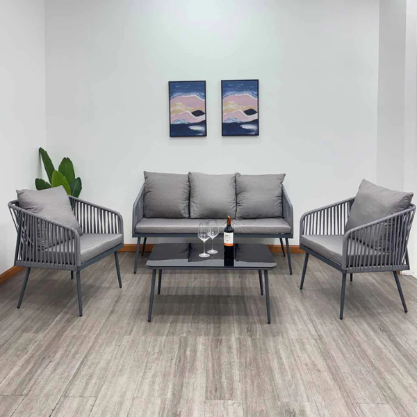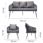 Este conjunto incluye un sofá triple, dos sillones individuales y una mesa de centro, por lo que ofrece espacio suficiente para reuniones o momentos de descanso. Al mismo tiempo, la estructura de acero galvanizado aporta firmeza y una gran estabilidad, lo que se traduce en un uso seguro y confiable durante más tiempo.