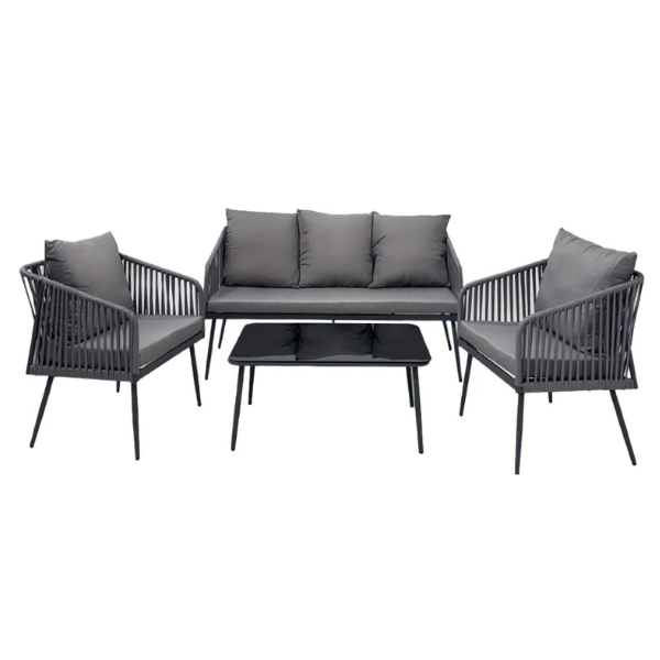 Este conjunto incluye un sofá triple, dos sillones individuales y una mesa de centro, por lo que ofrece espacio suficiente para reuniones o momentos de descanso. Al mismo tiempo, la estructura de acero galvanizado aporta firmeza y una gran estabilidad, lo que se traduce en un uso seguro y confiable durante más tiempo.