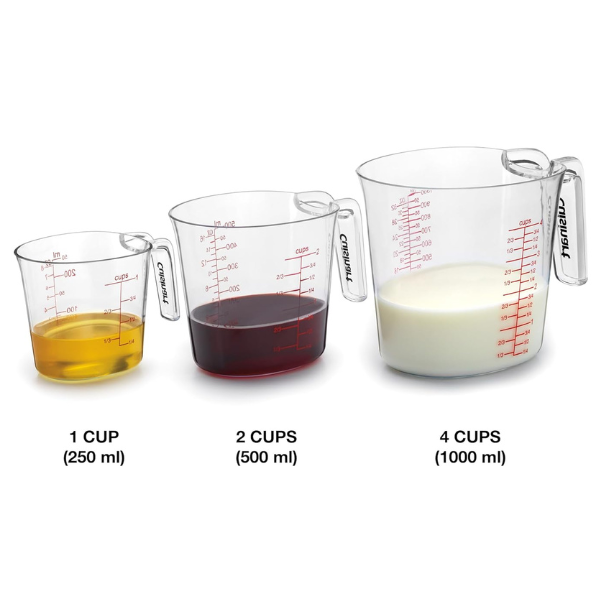 Cada vaso medidor está fabricado con materiales duraderos y seguros para el uso diario. El modelo incluye tres tamaños esenciales: 1 taza, 2 tazas y 4 tazas, ideales para medir líquidos o ingredientes secos con facilidad. Además, la base antideslizante garantiza estabilidad durante el uso, evitando derrames y ofreciendo un control total al cocinar.