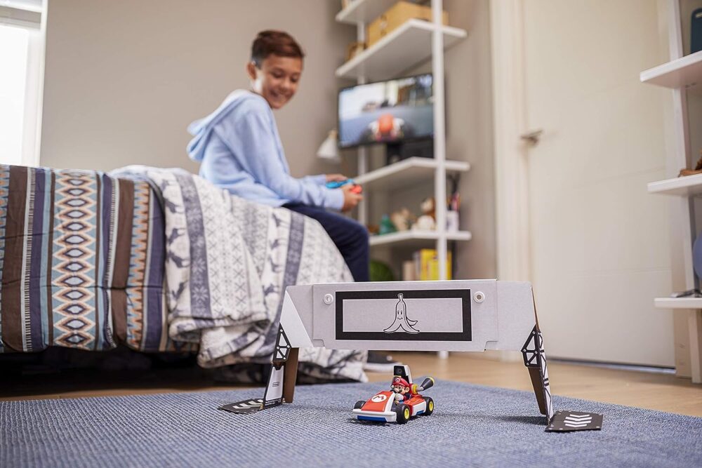 Mario Kart Live: Home Circuit te permite crear y personalizar tus propias pistas de carreras usando partes físicas y tecnología de realidad aumentada. Coloca diferentes objetos alrededor de tu habitación para diseñar el recorrido y luego observa cómo el juego transforma tu entorno en una pista de carreras llena de obstáculos, potenciadores y el icónico caos de Mario Kart.
