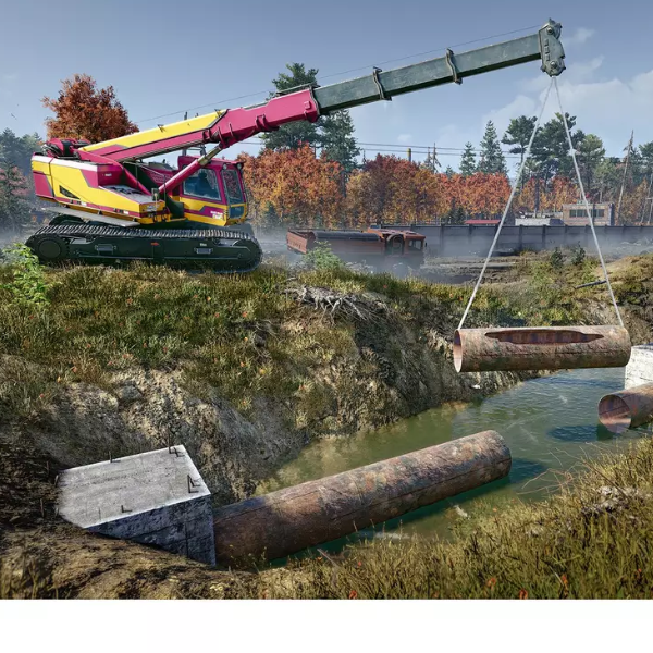 El juego, creado por Saber Interactive, tiene un motor moderno que hace que los vehículos se muevan de forma realista. Incluye bulldóceres, pavimentadoras, rodillos y grúas para construir carreteras, mover equipos y reconectar fábricas. Esto hace que cada tarea sea diferente y divertida.